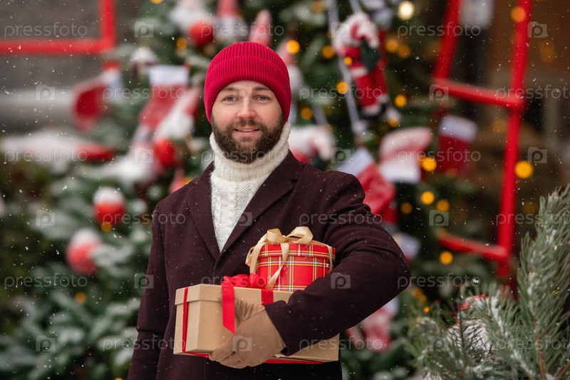 Счастливый улыбающийся мужчина в зимней одежде идет с подарками в руках по украшенной Рождеством улице в снежный день. Рождественские покупки