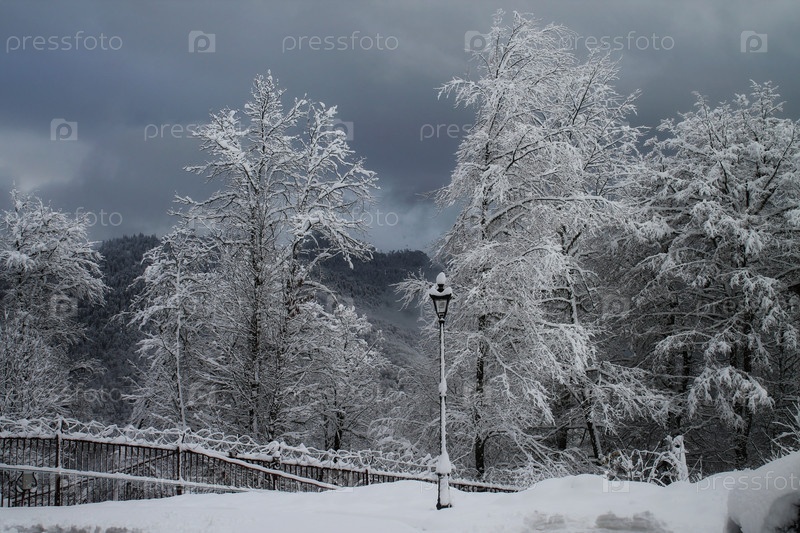Заснеженные деревья на фоне пасмурного неба в горах