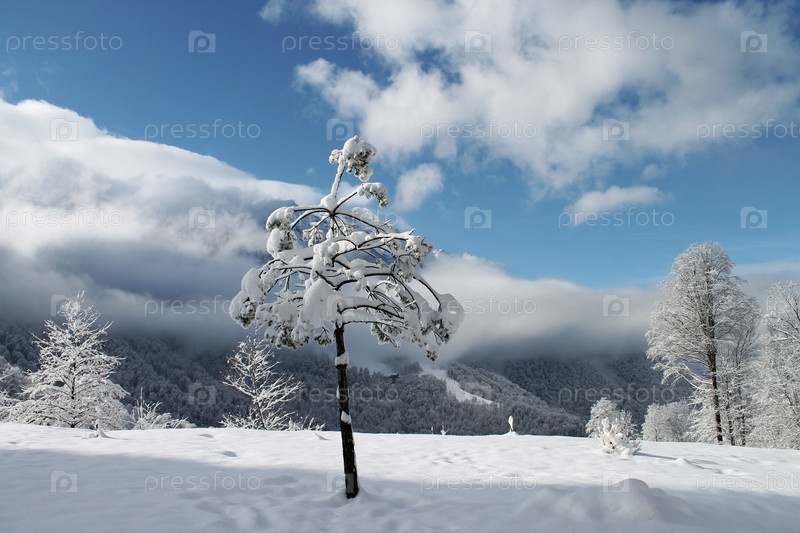 Зимний пейзаж с горами и заснеженными деревьями