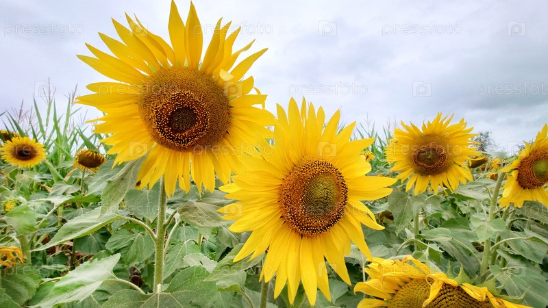 Яркие желтые подсолнухи в пасмурный летний день