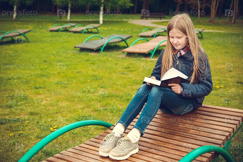 Школьница сидит в парке и читает книгу
