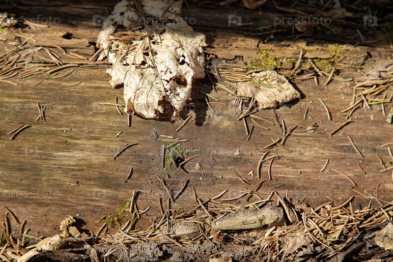 Старый ствол лежащего дерева покрыт сухой листвой и иголками, вид сверху крупным планом