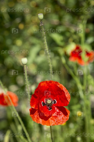 Ярко-красный цветок маки (Pap ver) цветёт под солнечными лучами в саду