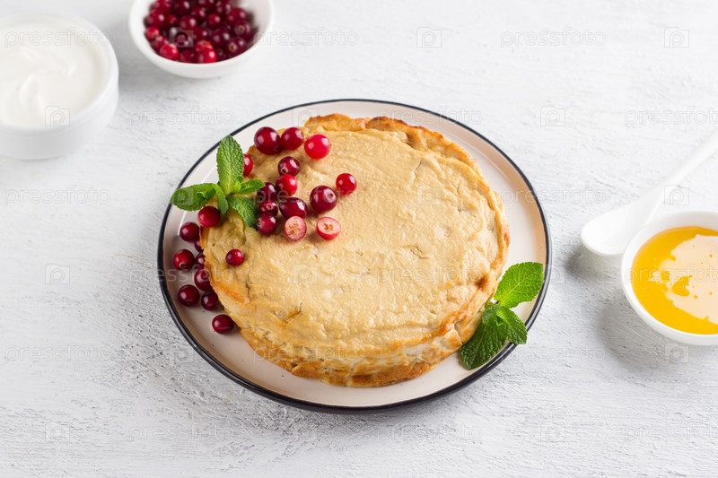 Домашняя полезная низкокалорийная творожная запеканка с яблоком, подается со свежей клюквой, мятой, медом и сметаной на светло-сером фоне