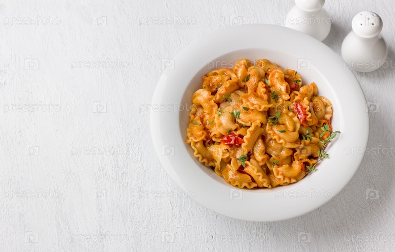 Простая паста с томатным соусом, посыпанная свежим тимьяном в белой тарелке на светло-сером фоне, вид сверху, плоская выкладка. Вкусная домашняя еда