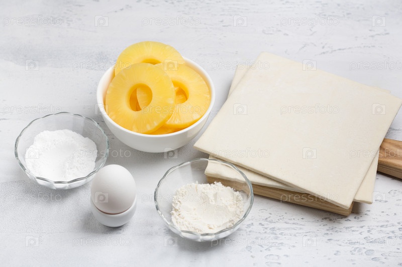 Ингредиенты для выпечки: слоеное тесто, кольца ананаса, мука, яйцо и сахарная пудра на светло-сером фоне, вид сверху. Готовим вкусные домашние слойки