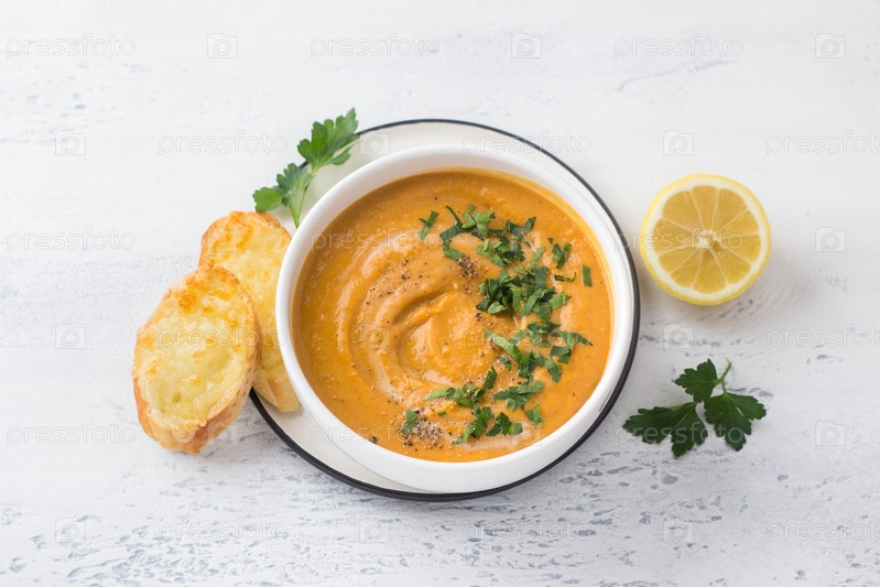 Чечевичный крем-суп с петрушкой и сырными гренками на светло-голубом фоне