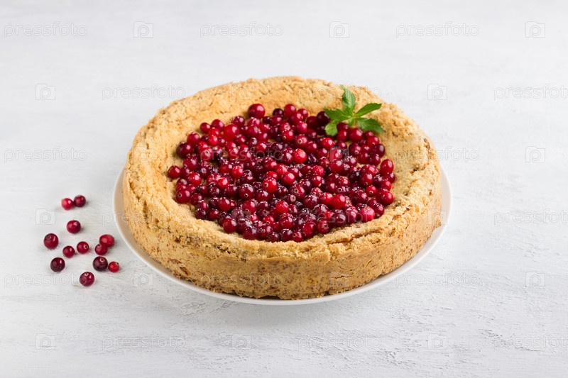 Королевский творожный чизкейк, украшенный клюквой, мятой и посыпанный сахарной пудрой на светло-сером фоне