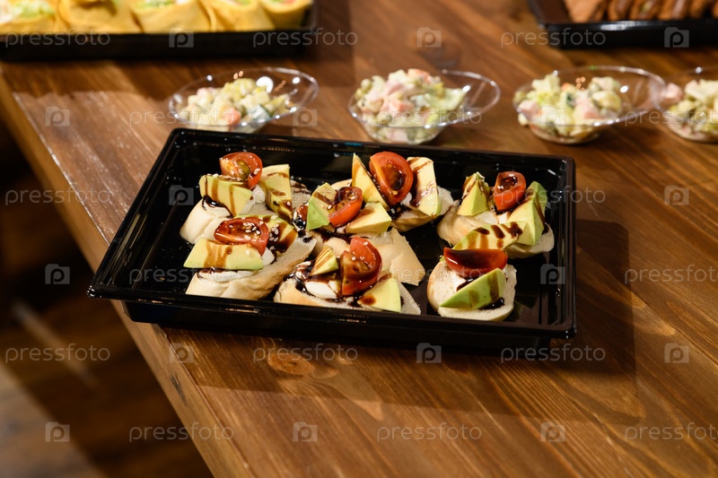 Авокадо и свежие нарезанные помидоры на поджаренном тосте на коричневом деревянном фоне. Закуска на вечеринке