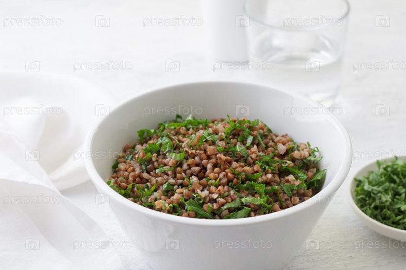 Белая миска с вареной гречкой и капустой на сером фоне, вид сверху. Здоровая домашняя веганская еда