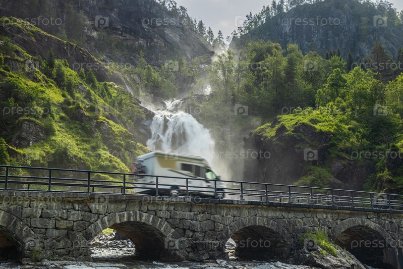 Поездка на отдых в автодоме, автокемпинге Отпуск. Путешествие в автодоме по дороге Водопад Латефоссен Одда Норвегия. Латефоссен — мощный двойной водопад