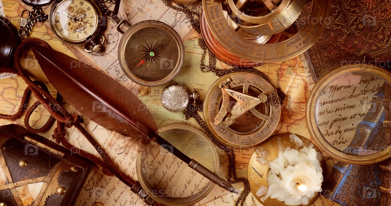 Путешествия и приключения в винтажном стиле. Винтажный старый компас и другие винтажные предметы на столе