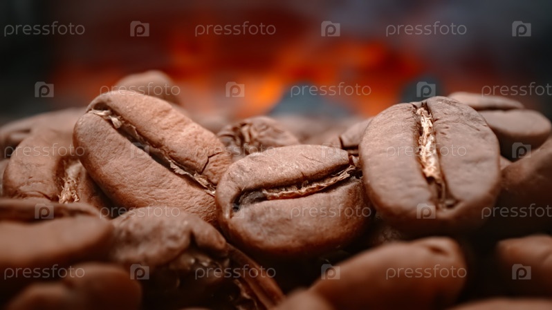 Крупный план семян кофе. Ароматные кофейные зерна обжариваются, дым исходит от кофейных зерен