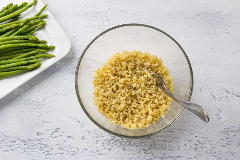 Стеклянная миска с булгуром и тарелка со спаржей на светло-голубом фоне. Готовим вкусный домашний веганский салат Табуле из спаржи