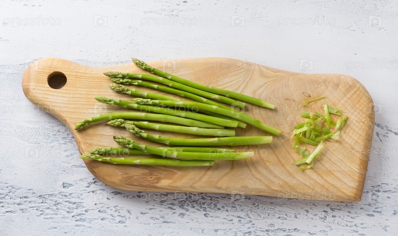 Деревянная доска со свежей спаржей с нарезанными жесткими кусочками на светло-голубом фоне, домашняя кухня