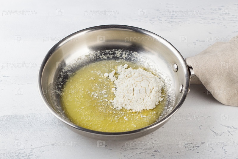 Мука добавляется в растопленное масло на сковороде на светло-сером фоне. Приготовление соуса для сырной пасты, шаг за шагом, сделай сам, шаг 2