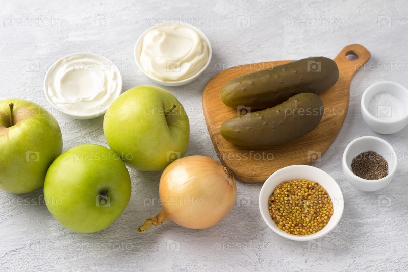 Ингредиенты для традиционного польского салата: яблоки, соленые огурцы, лук, майонез, сметана или йогурт, горчица, соль, черный перец на светло-сером фоне, вид сверху. Готовим вкусную домашнюю еду