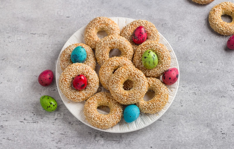 Белая тарелка с традиционным греческим пасхальным печеньем Koulourakya или песчаными кольцами Koulourya с кунжутом, украшенные окрашенными яйцами на сером фактурном фоне
