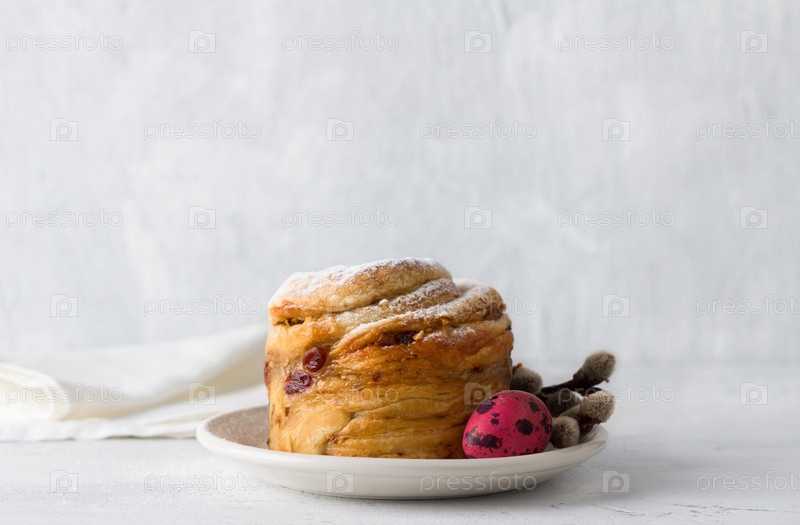 Пасхальный кулич Краффин с орехами и сухофруктами, посыпанный сахарной пудрой, украшенный крашеным яйцом и веточками вербы на светло-голубом фоне