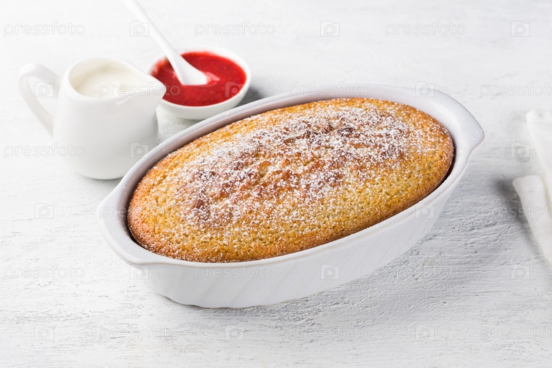 Свежеприготовленный манник, манный пирог в форме, посыпанный сахарной пудрой, со сметаной и ягодным соусом на светло-сером фоне