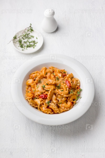 Простая паста с томатным соусом, посыпанная свежим тимьяном в белой тарелке на светло-сером фоне, вид сверху, плоская выкладка. Вкусная домашняя еда