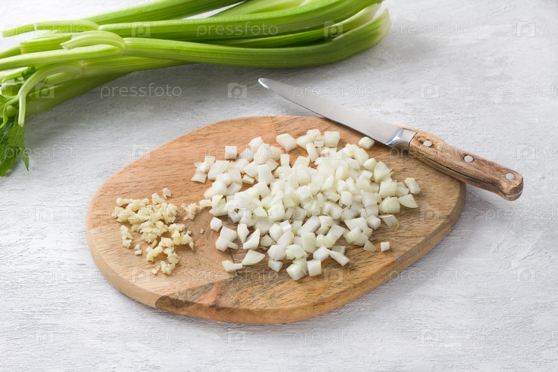 Деревянная доска с нарезанным луком и чесноком, стеблем сельдерея и кухонным ножом на светло-сером фоне. Готовим домашнюю здоровую пищу