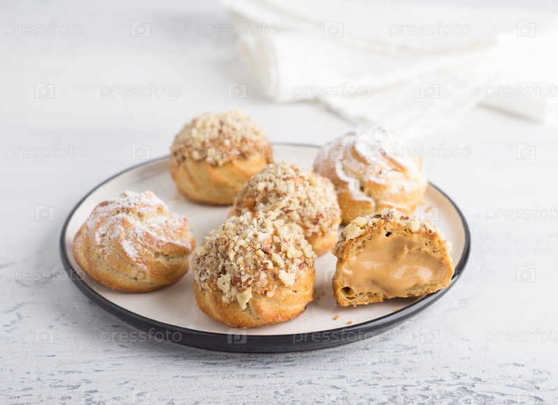 Безглютеновые овсяные профитроли с карамельным кремом из вареного сгущенного молока, посыпанные сахарной пудрой и орехами на светло-голубом фоне. Вкусная домашняя еда
