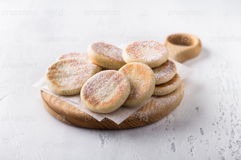 Деревянная доска с простым вкусным домашним печеньем, испеченным на сковороде на светлом фоне