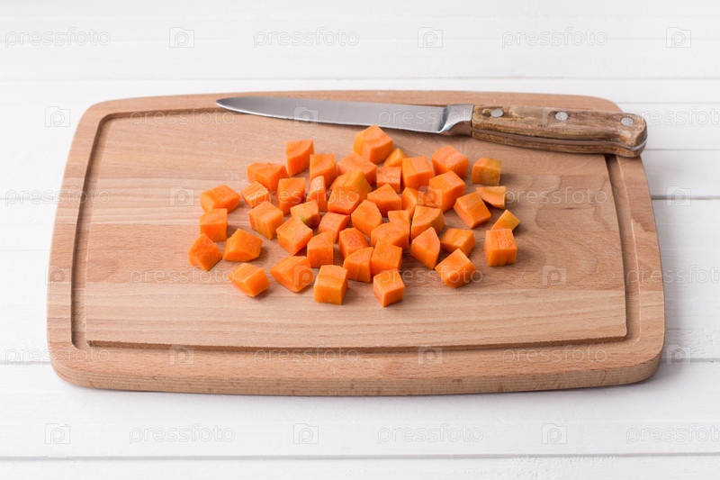 Деревянная доска с нарезанной кубиками морковью на белом деревянном фоне