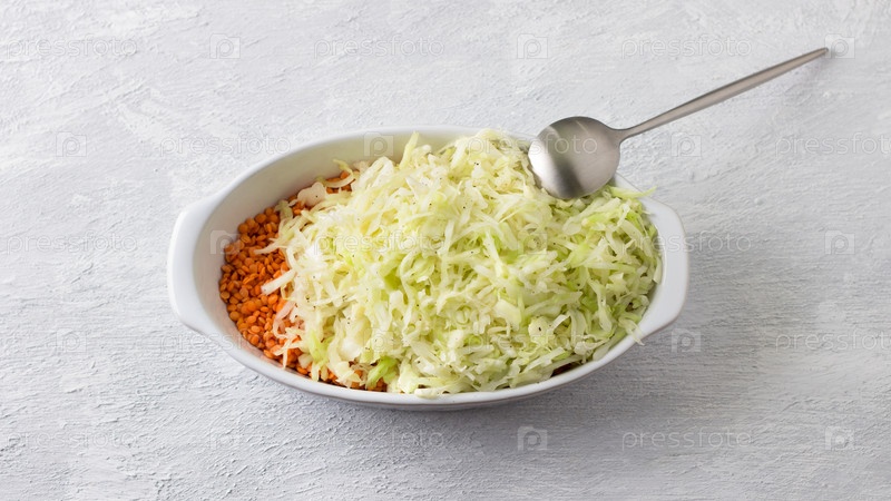 Керамическая форма с красной чечевицей и белокочанной капустой на светло-сером фоне, вид сверху. Готовим вкусную домашнюю еду