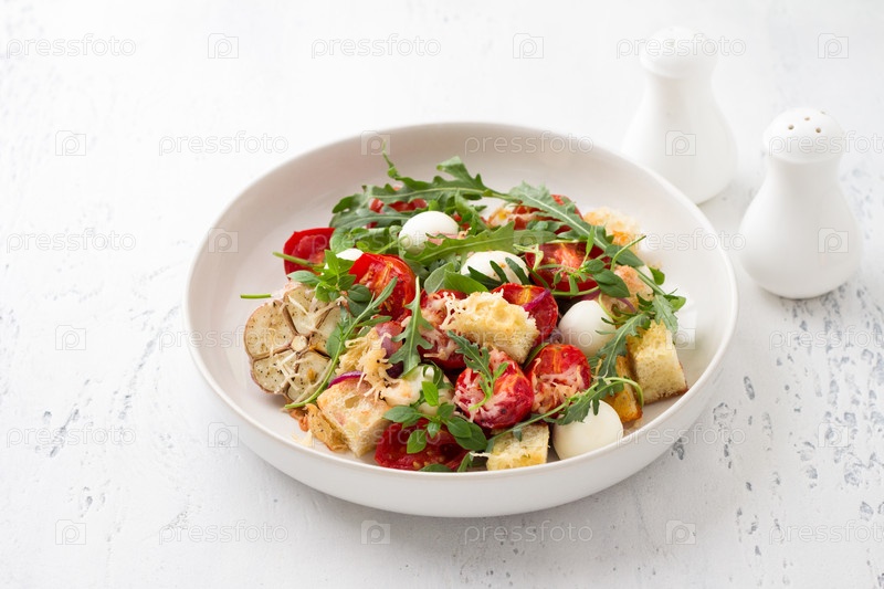 Запеченная панцанелла, традиционный итальянский салат с помидорами, моцареллой, пармезаном, хрустящими гренками, рукколой и базиликом на светло-голубом фоне