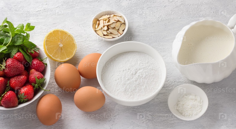 Ингредиенты: сахарная пудра, яйца, крахмал, клубника, жирные сливки, лимон, миндаль для приготовления традиционного безе-торта «Павлова» со взбитыми сливками и свежей клубникой на светло-сером фоне