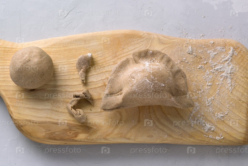 Выпечка пирожков из ржаного теста на деревянной доске, вид сверху. Этап приготовления