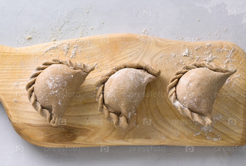 Выпечка пирожков из ржаного теста на деревянной доске, вид сверху. Этап приготовления