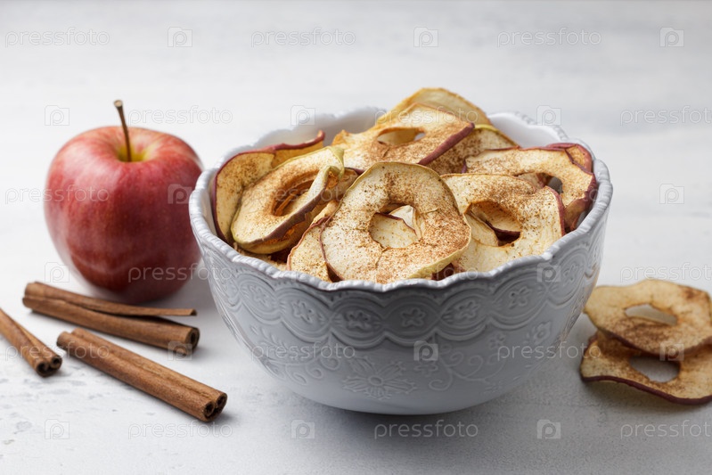Домашние сушеные яблоки с корицей, яблочные чипсы в миске с палочками корицы на светло-сером фоне. Вкусная здоровая закуска
