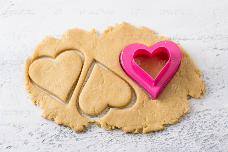 Вырезание печенья в форме сердца формочками для печенья на светло-голубой столешнице, вид сверху. Этап приготовления вкусной домашней выпечки