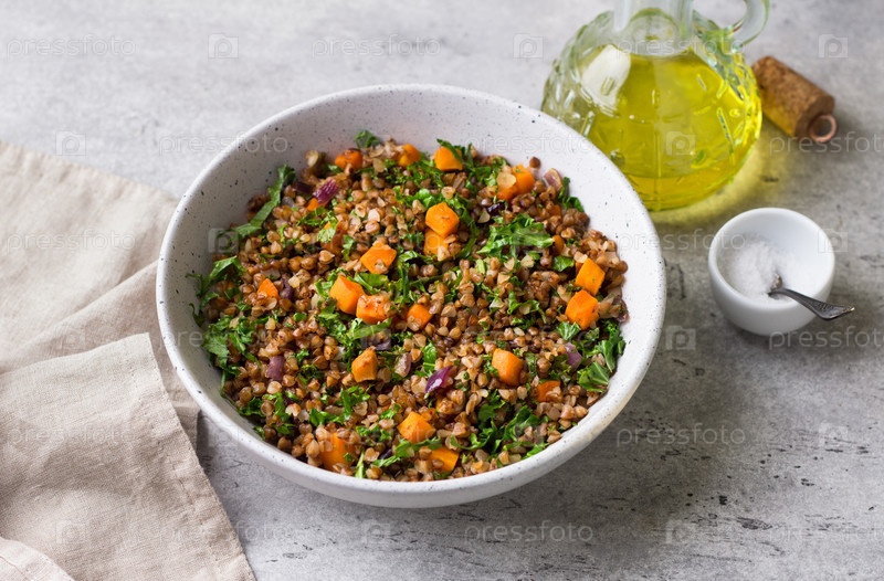 Гречка с овощами и капустой на сером текстурированном фоне, вид сверху. Вкусная здоровая веганская еда