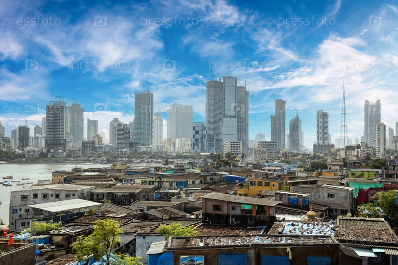 Вид на трущобы на побережье Мумбаи, Индия, на фоне строящихся небоскребов