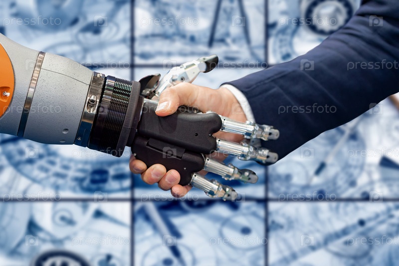 Рука бизнесмена пожимает руку роботу-андроиду