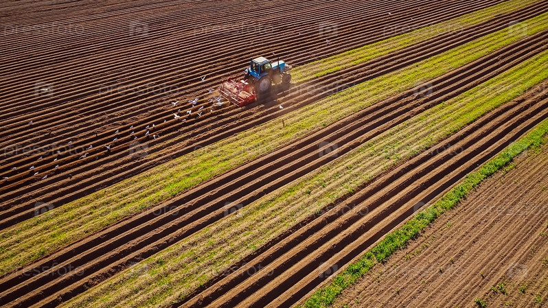 Сельскохозяйственные работы на тракторе фермер сеет зерно. Голодные птицы летят за трактором, и поедают зерно с пашни