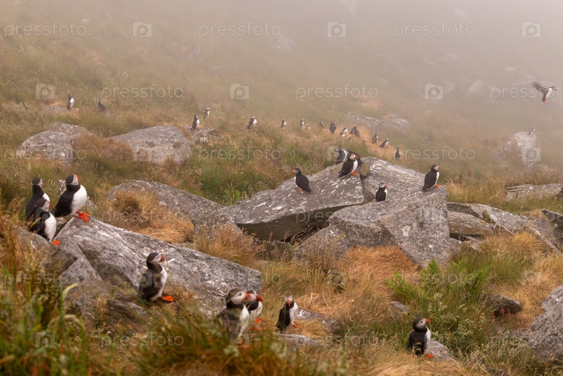Атлантический тупик (Fratercula arctica) на скале на острове Рунде, Норвегия