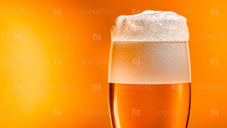 Светлое пиво оседает в бокале с белой шапкой пены