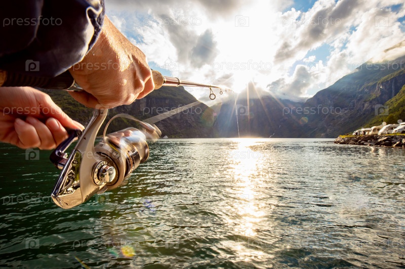 Женщина ловит рыбу на спиннинговую удочку в Норвегии