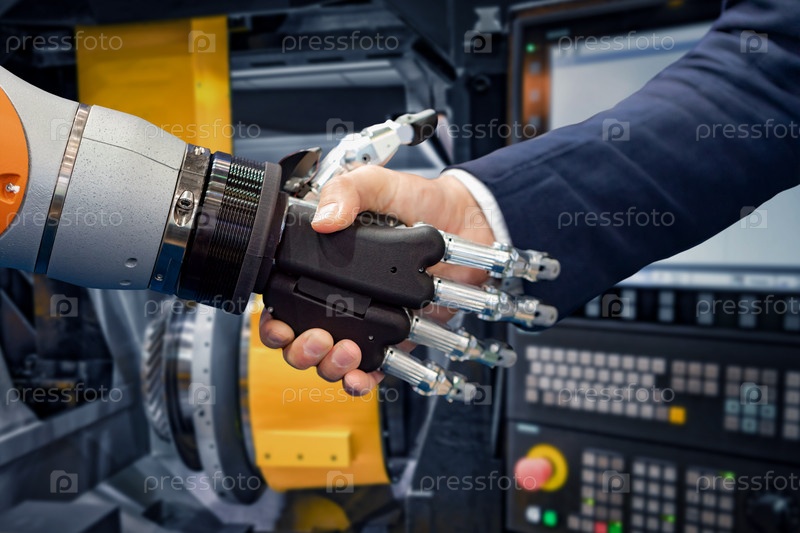 Рука бизнесмена пожимает руку роботу-андроиду