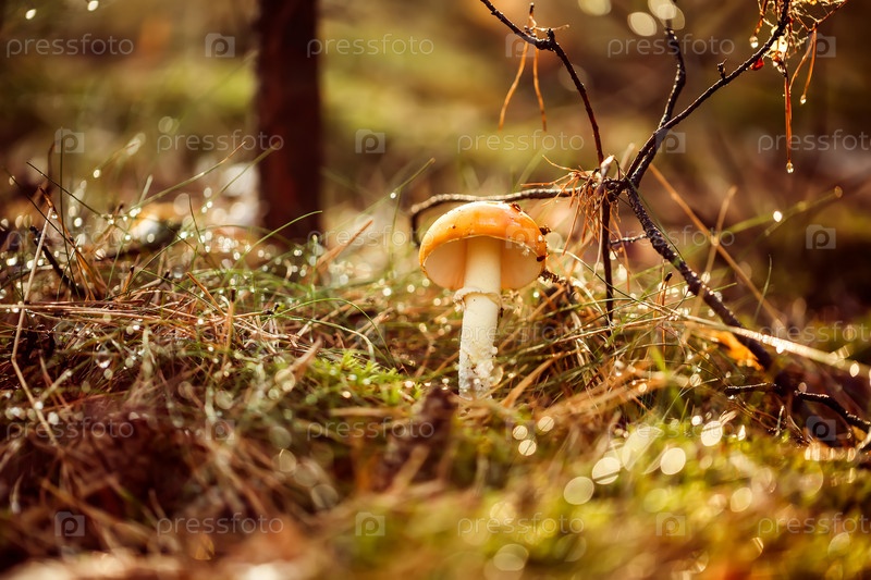 Amanita muscaria, гриб-мухомор В солнечном лесу под дождем
