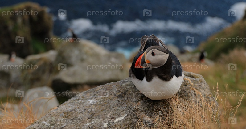 Атлантический тупик (Fratercula arctica) на скале на острове Рунде, Норвегия