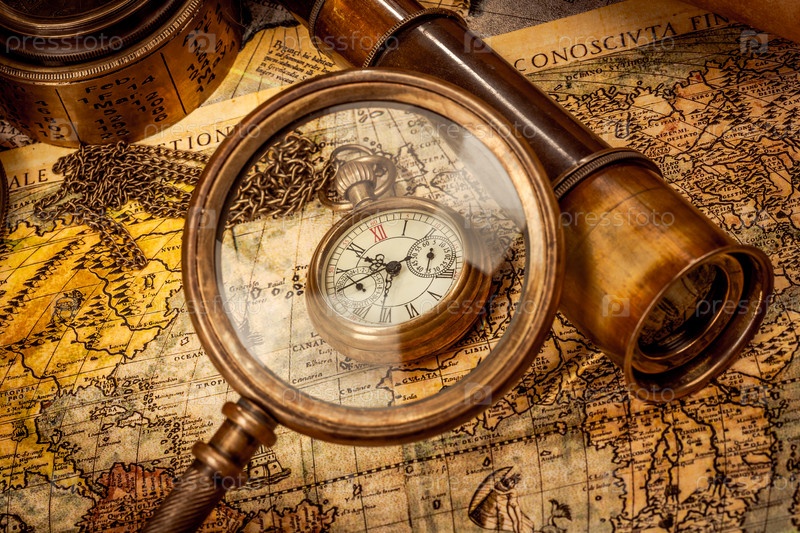 Путешествия и приключения в винтажном стиле. Винтажный старый компас и другие винтажные предметы на столе
