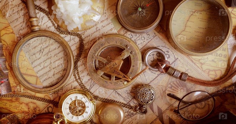 Путешествия и приключения в винтажном стиле. Винтажный старый компас и другие винтажные предметы на столе