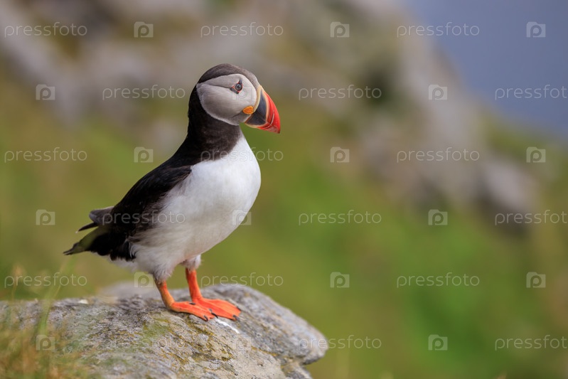 Атлантический тупик (Fratercula arctica) на скале на острове Рунде, Норвегия