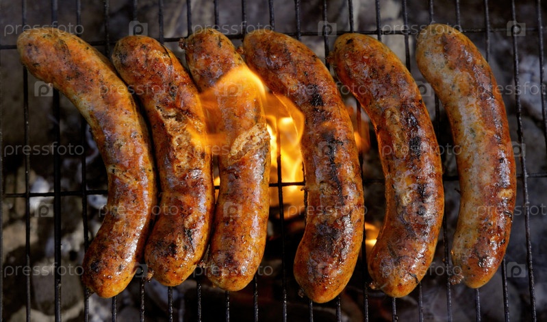 Вкусные сочные колбаски, приготовленные на гриле с использованием огня